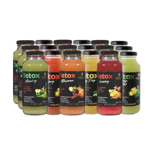 - Детокс пакетът съдържа 18 детокс сокове по 250 мл всяка бутилка и 6 различни вида, които се консумират в рамките на 3 дни.